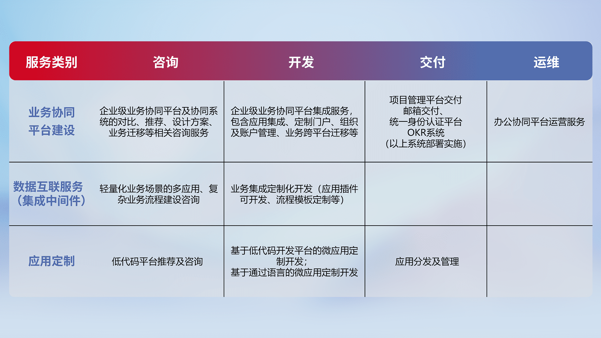 针对钉钉、、、企微、、IDaas等平台级产品提供产品的规划、、、方案、、交付、、定制化开发等服务,,,实现如统一协同办公、、、智能客户服务、、、混合会议管理、、、智能数据查询、、、等业务场景,,实现数字化转型。。。。