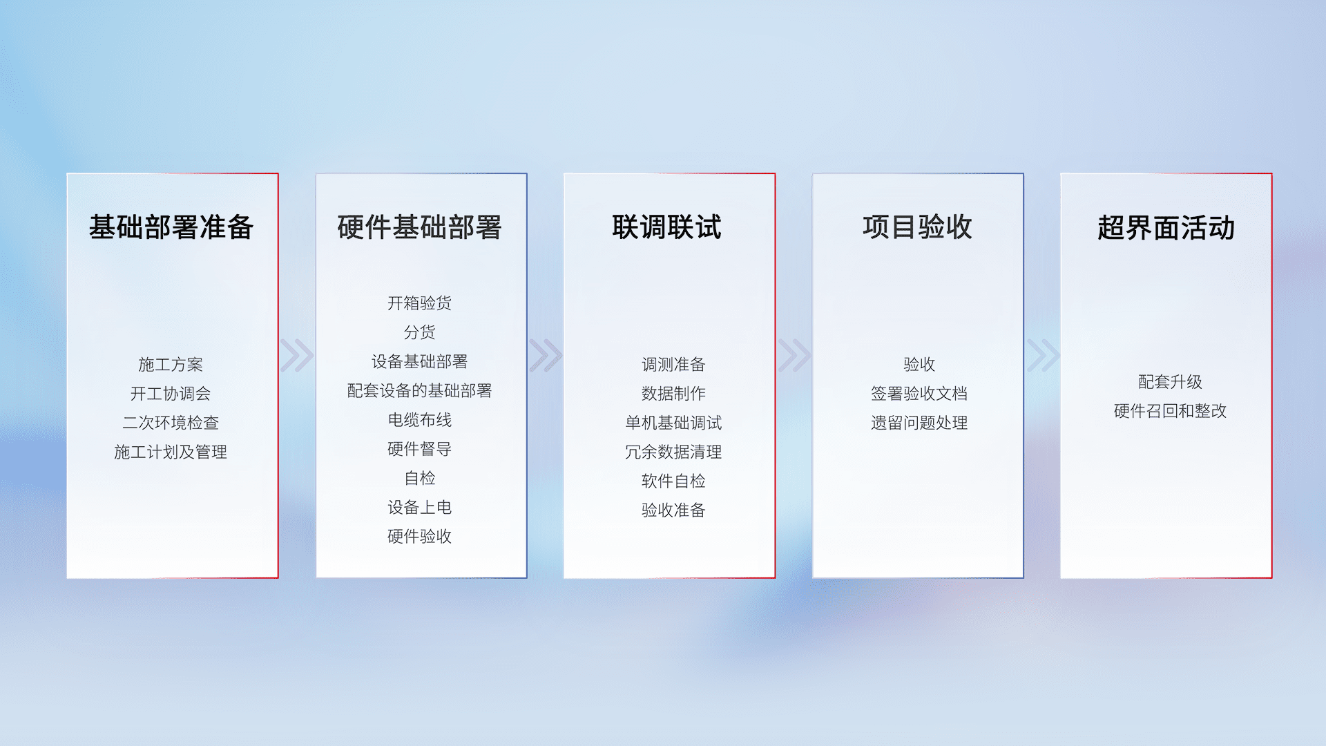 从基础部署准备、、硬件基础部署、、、联调联试、、项目验收、、越界面活动的全过程可追溯,,,,保证施工质量和进度。。