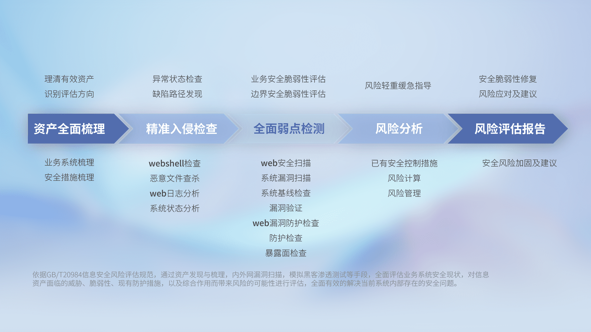 针对客户行业特性,,,以专业的安全服务+多厂商联合解决方案提供专属的一站式安全管理服务,,,,帮助客户全面感知网络空间威胁,,,,基于识别、、、检测、、、、分析、、、、防护、、、监测、、、响应的服务理论模型,,从方案咨询、、、集成交付、、、、评估验证、、、、优化加固、、、运维运营,,致力于为客户提供完整的闭环管理式安全服务。。。。以实战经验为客户打造高抵御风险的安全体系,,,帮助客户发现威胁、、、、对抗威胁、、、、处置威胁,,,,不断积累安全对抗能力,,,,持续保障数字化安全。。。。